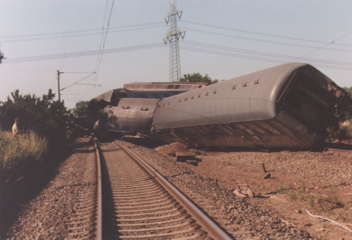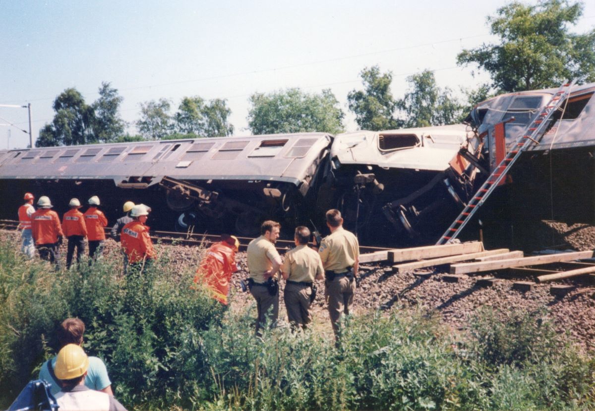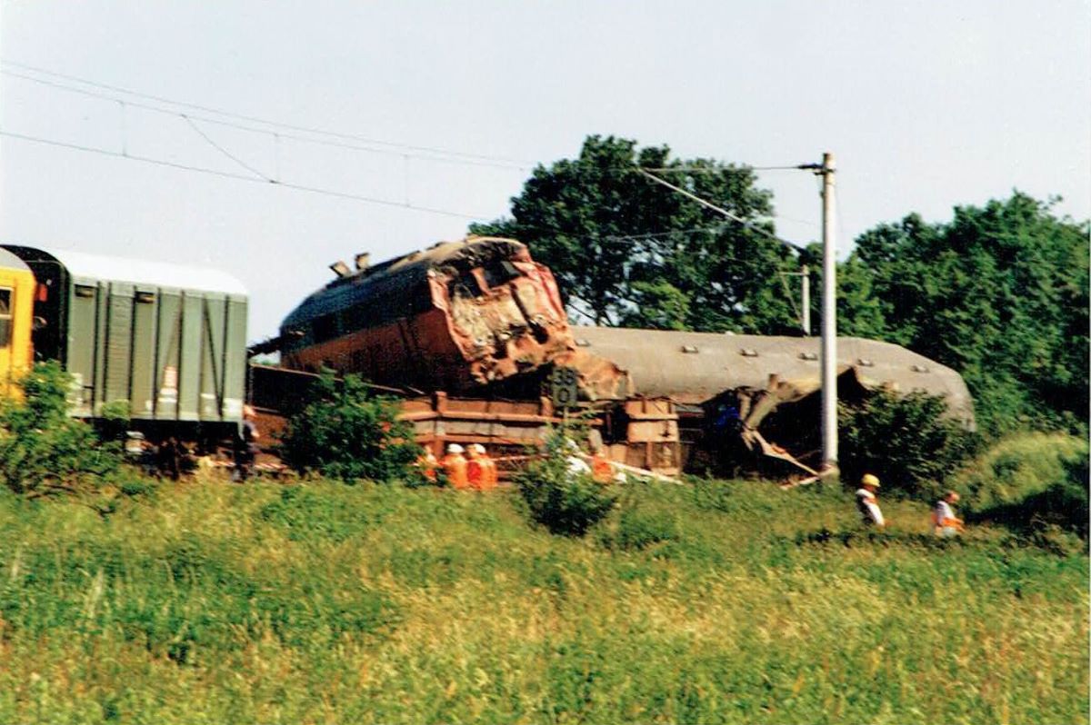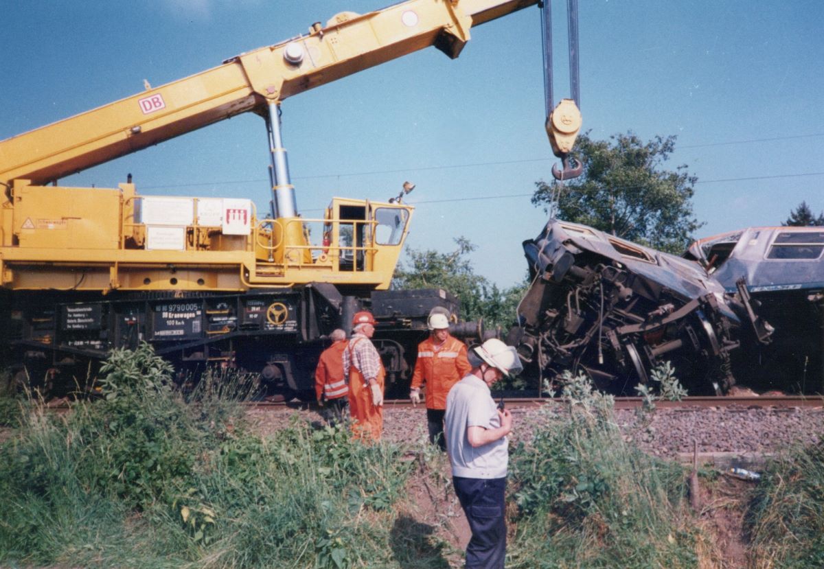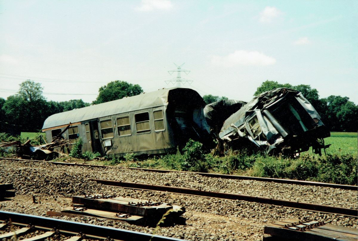 Wochenlang erinnerten noch einige zerstörte Güter- und Personenwagen, die auf einem Feld neben der Unfallstelle abgelegt worden waren, an das schwere Zugunglück. Die Unfalllok war für alle Reisenden sichtbar im Juli 1995 in Neumünster abgestellt.