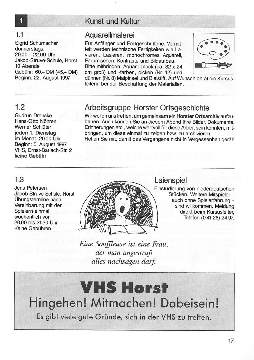Um die Vorteile eines eingetragenen Vereins nutzen zu können, ohne einen eigenen Verein gründen zu müssen, wurde beschlossen, sich der VHS Horst anzuschließen. Am 17.04.1997 fand das erste öffentliche Treffen der AG in den damaligen Räumlichkeiten der VHS, Ernst-Barlach-Straße 2, statt. Seit Herbst 1997 werden die Aktivitäten des Ortsarchivs offiziell als Kurs der Horster Volkshochschule angeboten.
