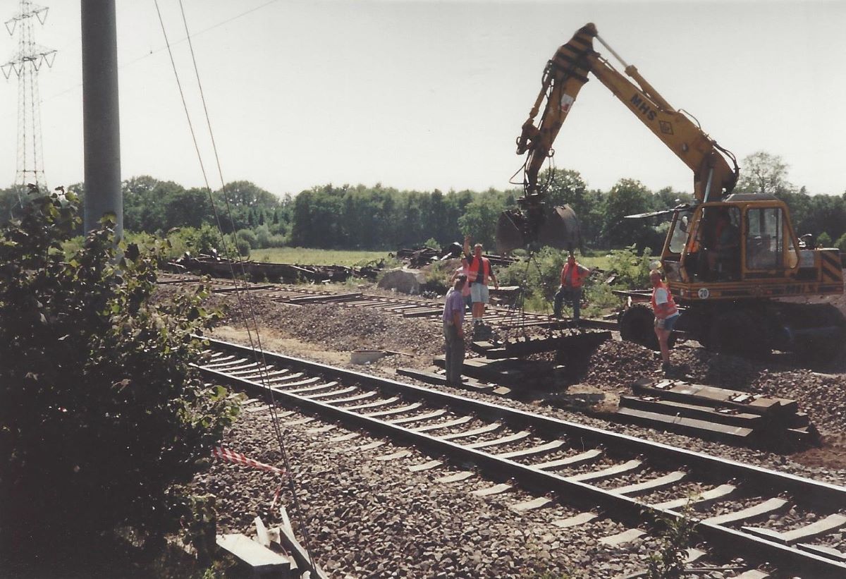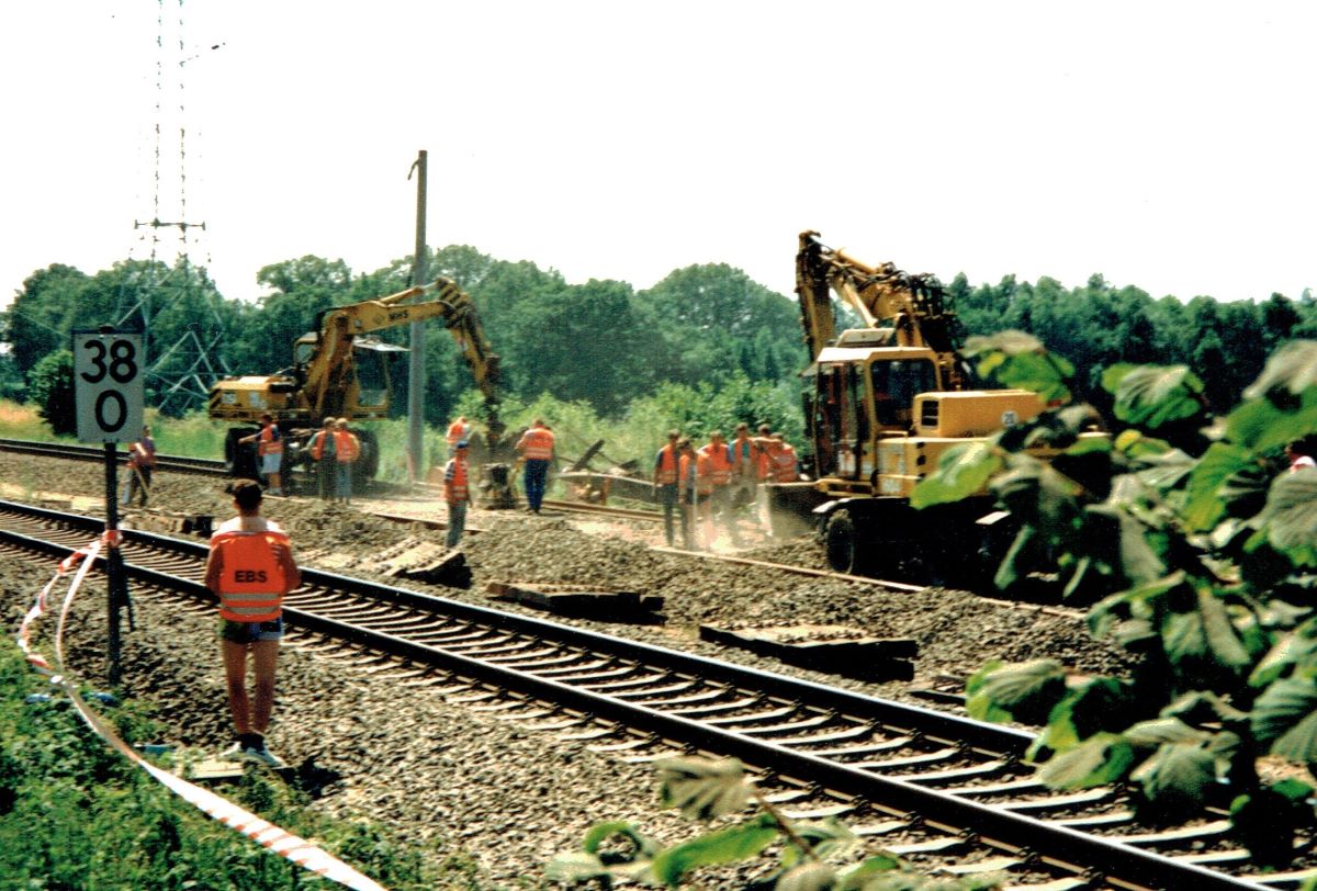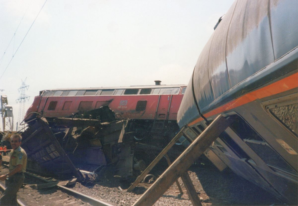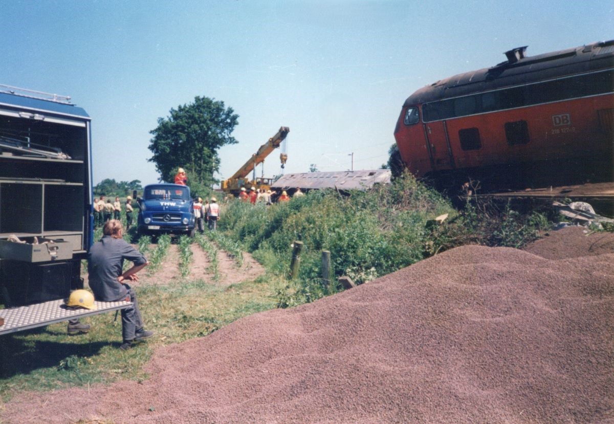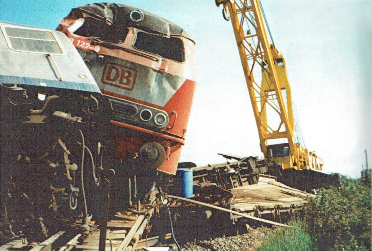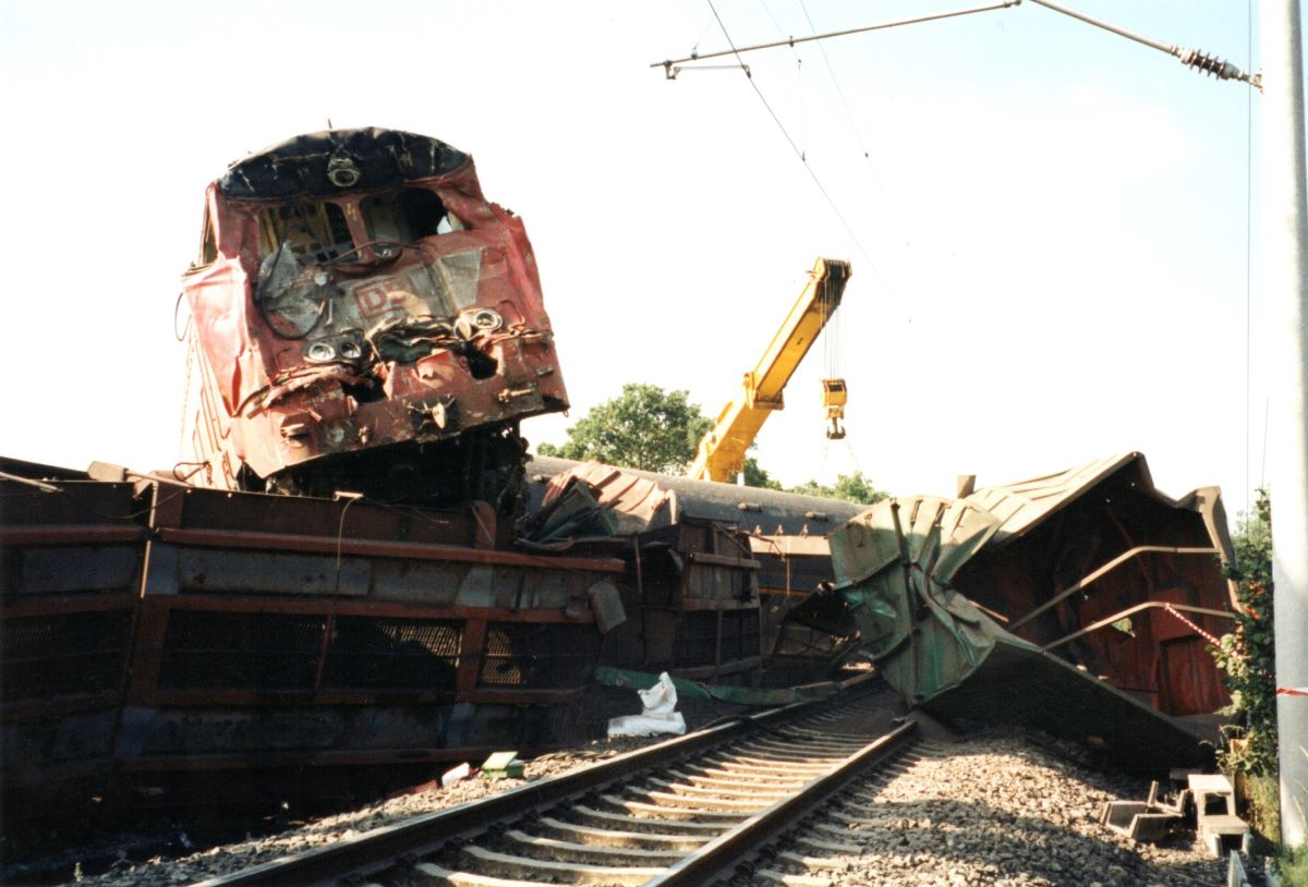 Wochenlang erinnerten noch einige zerstörte Güter- und Personenwagen, die auf einem Feld neben der Unfallstelle abgelegt worden waren, an das schwere Zugunglück. Die Unfalllok war für alle Reisenden sichtbar im Juli 1995 in Neumünster abgestellt.