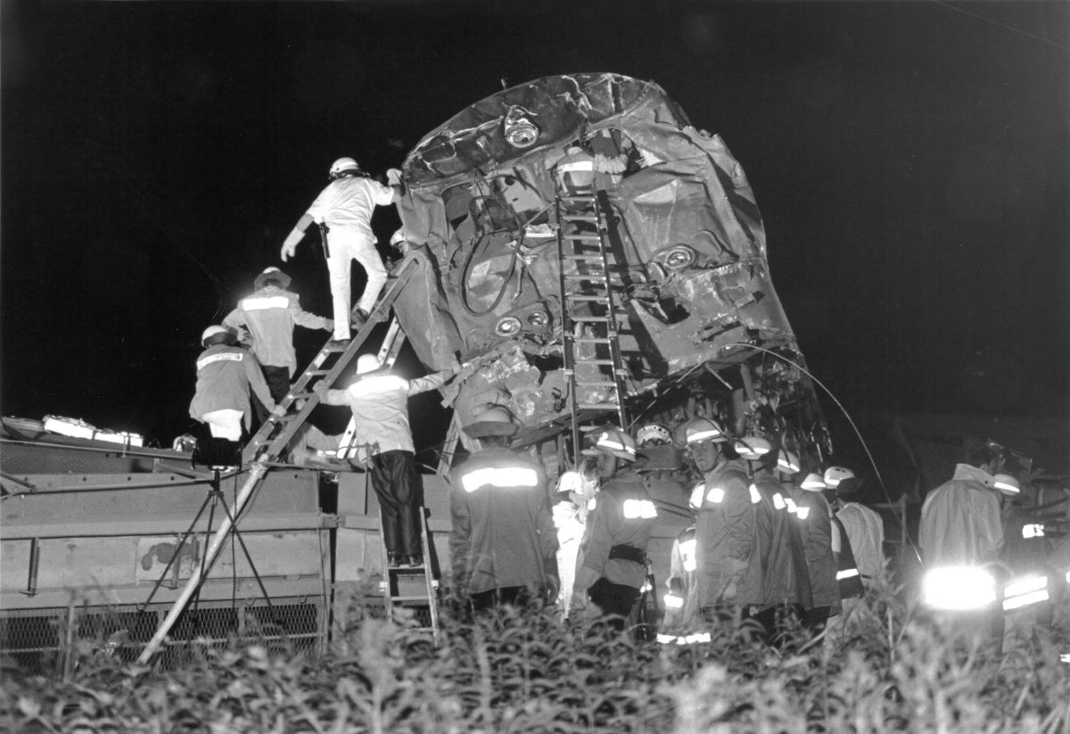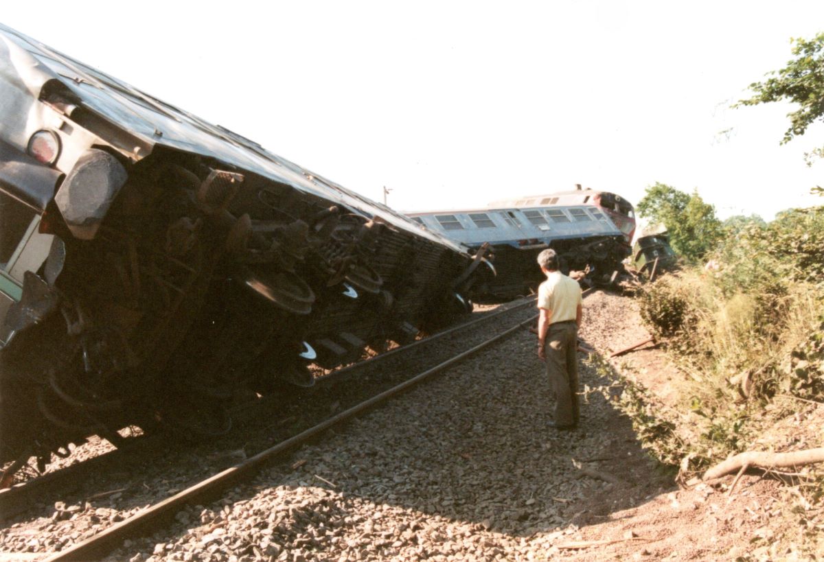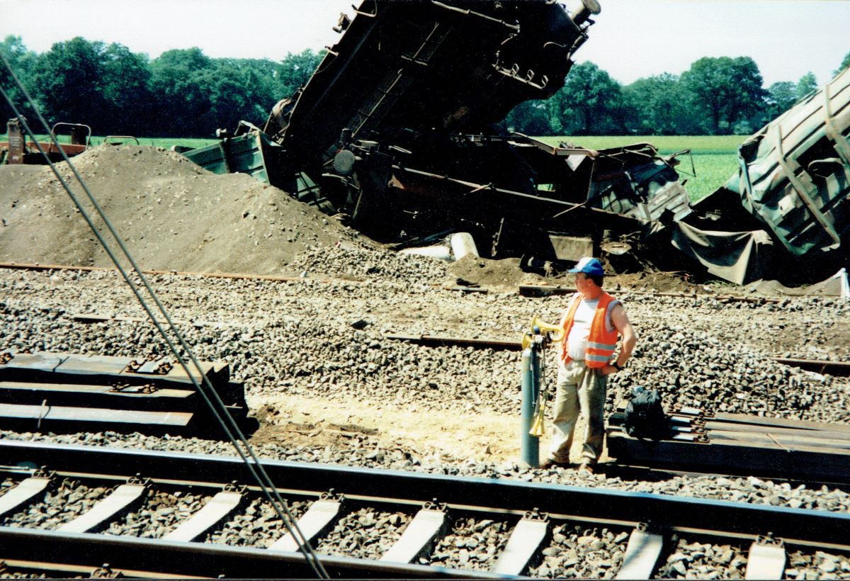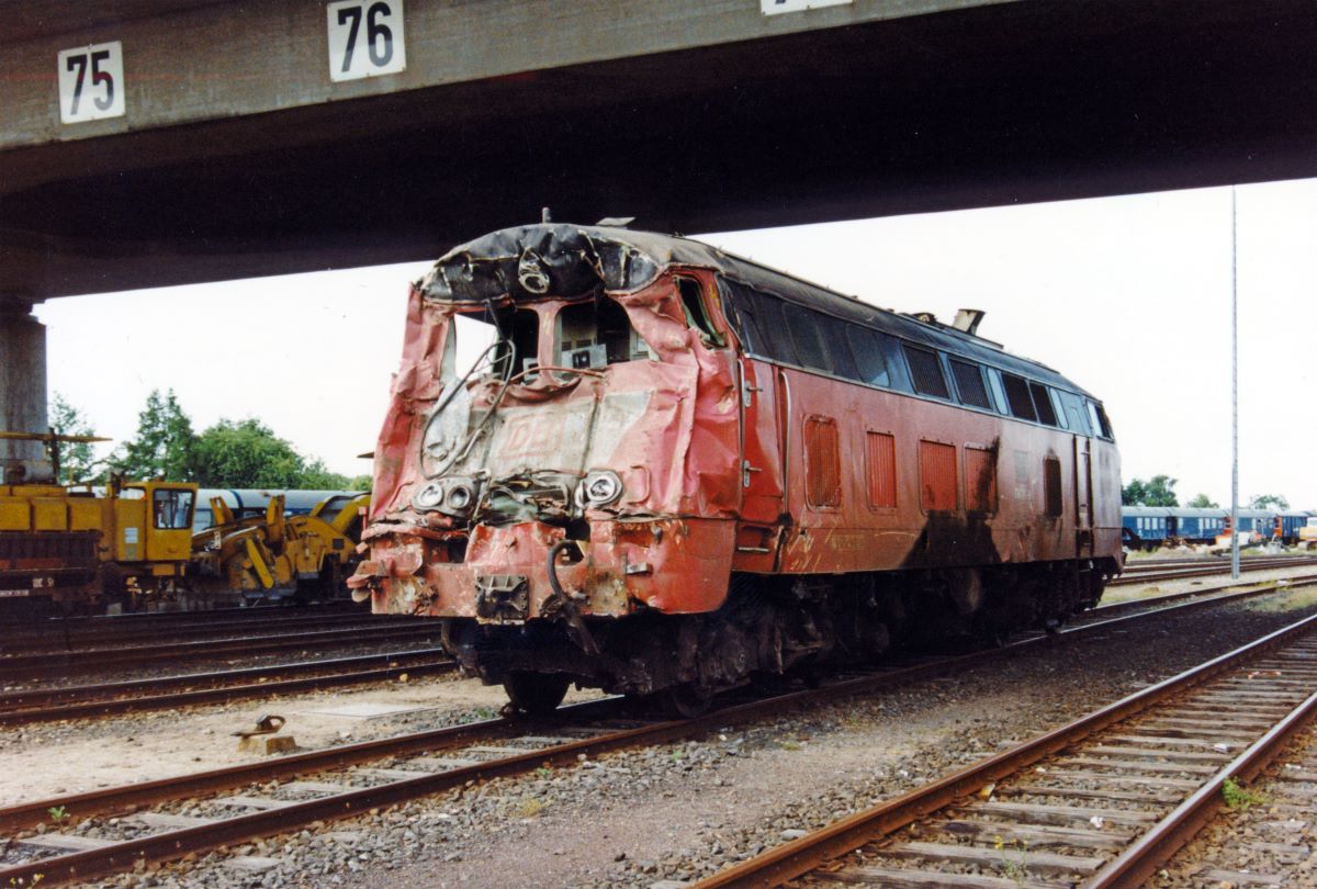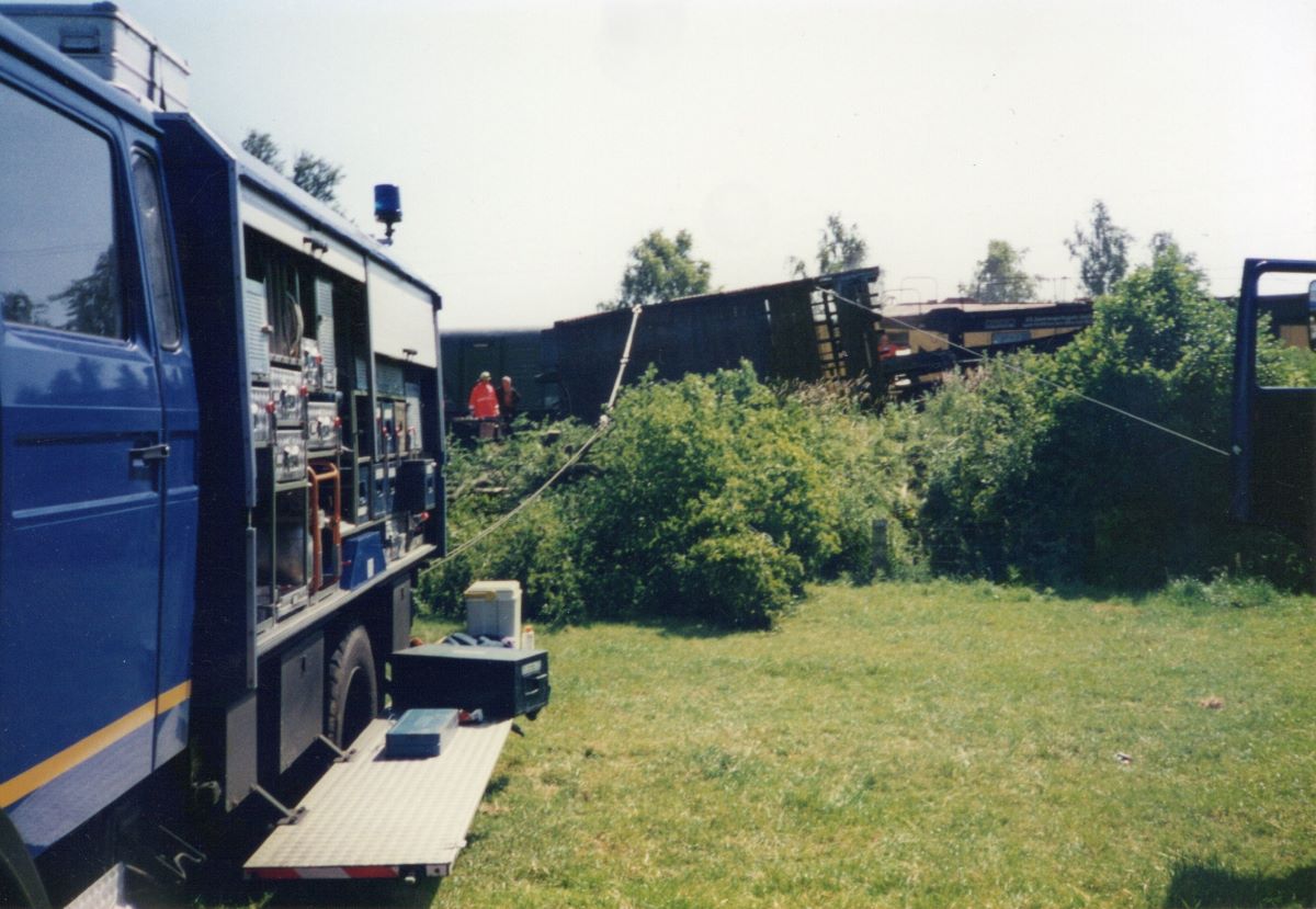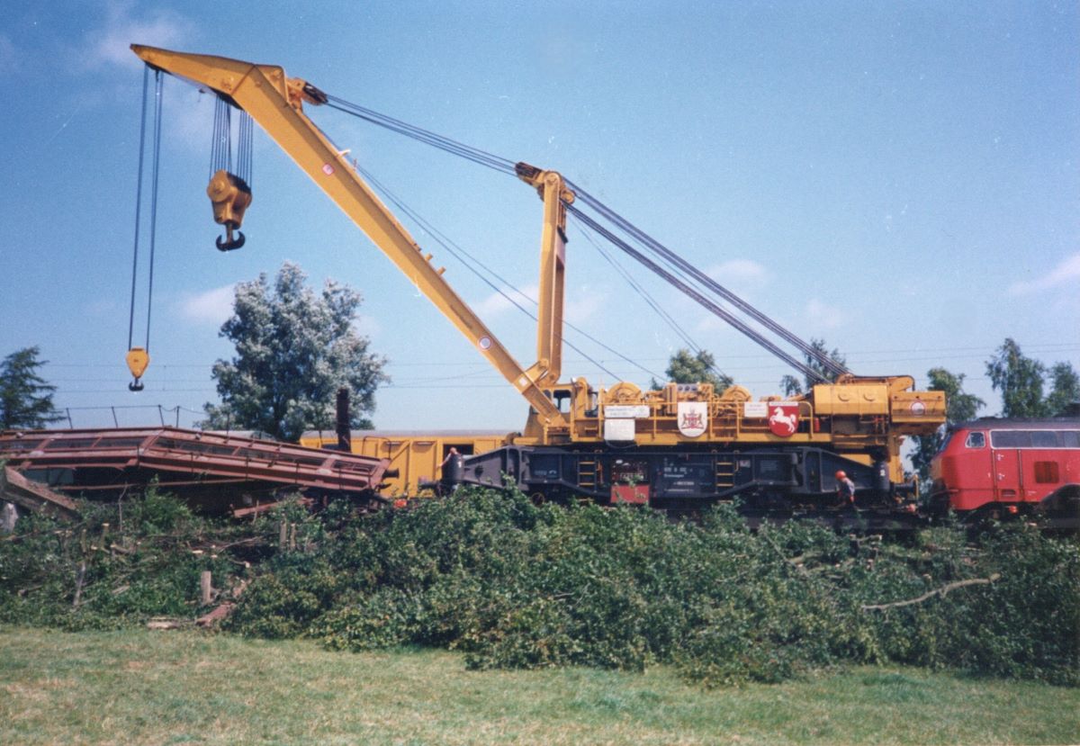 Wochenlang erinnerten noch einige zerstörte Güter- und Personenwagen, die auf einem Feld neben der Unfallstelle abgelegt worden waren, an das schwere Zugunglück. Die Unfalllok war für alle Reisenden sichtbar im Juli 1995 in Neumünster abgestellt.