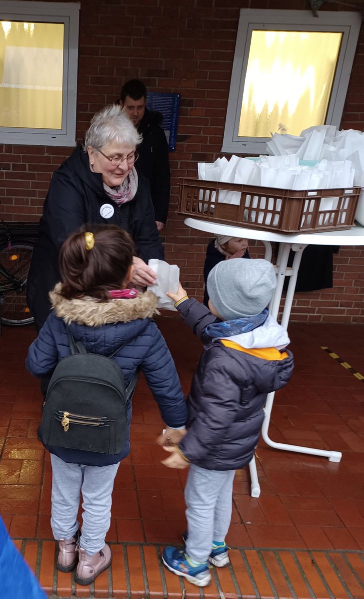 Dann wurden die Anwesenden von Inke Ratjen (Lehrerin an der Grundschule) und Werner Schlüter (Ortsarchiv) begrüßt. Sie erwähnten dabei kurz den Anlass der Aktion. Zudem bedankten sie sich bei der Horster Grundschule, den Kindergärten, dem Chor Zwischentöne und dem Musik-Corps Horst für die Unterstützung der Aktion.
