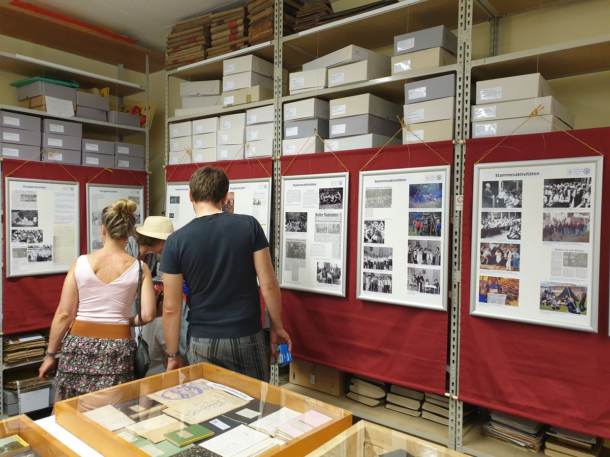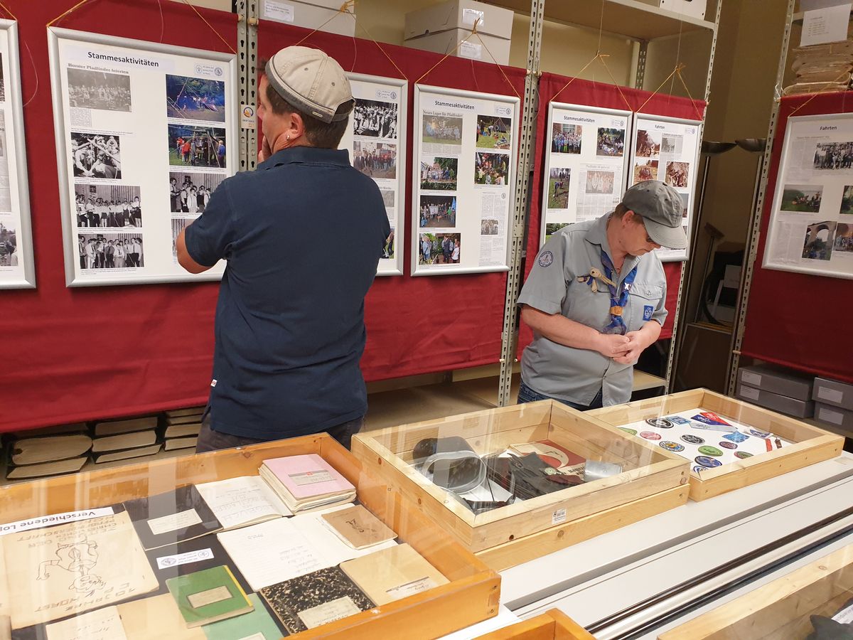 Die gleichen Plakate und zusätzlich einige Gebrauchsgegenstände der Pfadfinder*innen aus den vergangenen sechs Jahrzehnten waren auch am 18.06.2022 während des Familientags im Raum des Ortsarchivs im Vereinshaus „Op de Host“ zu sehen.