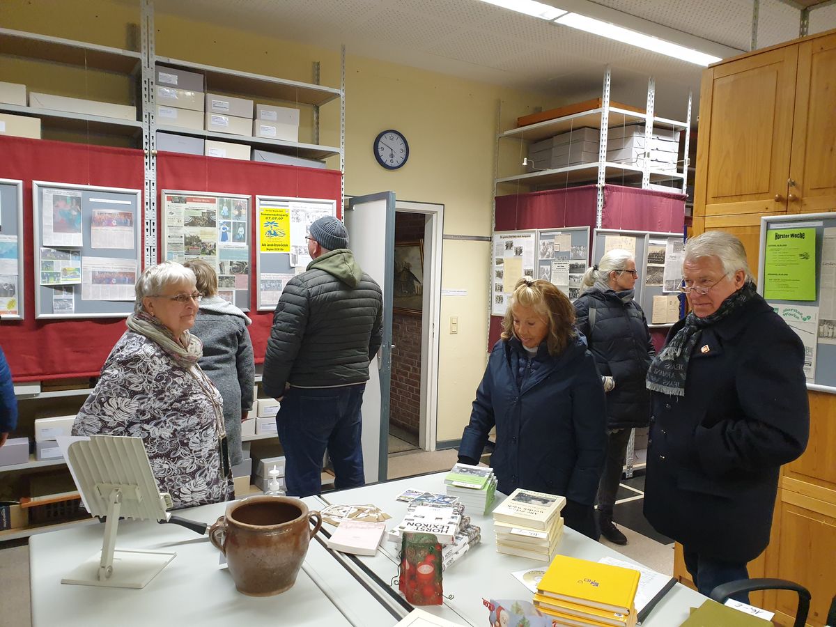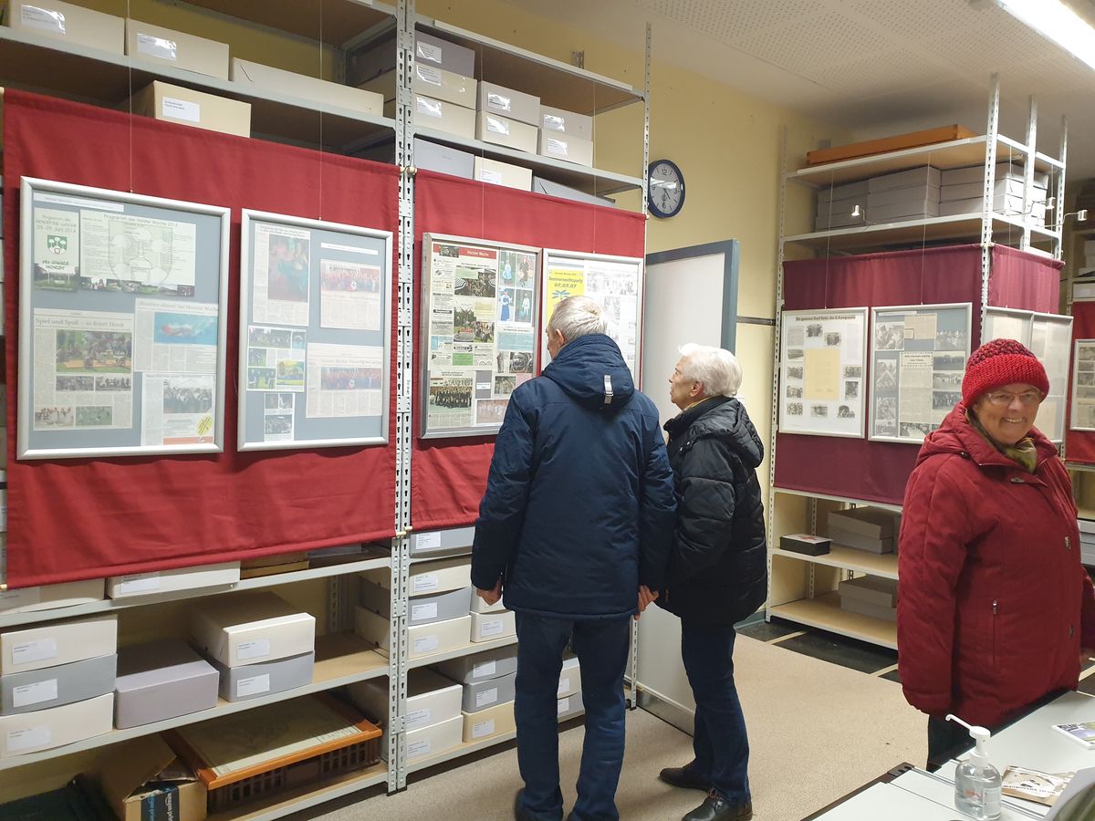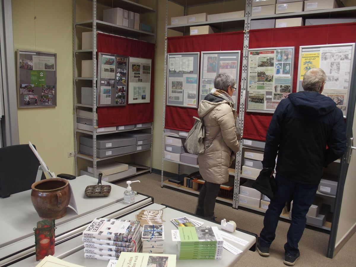 Die im Raum des Ortsarchivs präsentierte Ausstellung war gut besucht. Viele Interessenten kamen, um nachzuschauen, ob sie sich selbst oder Bekannte auf den gezeigten Fotos entdecken konnten. Etliche Besucher*innen erinnerten sich an besondere, zum Teil schon jahrzehntelang zurückliegende Erlebnisse, die sie während einer Horster Woche hatten.
