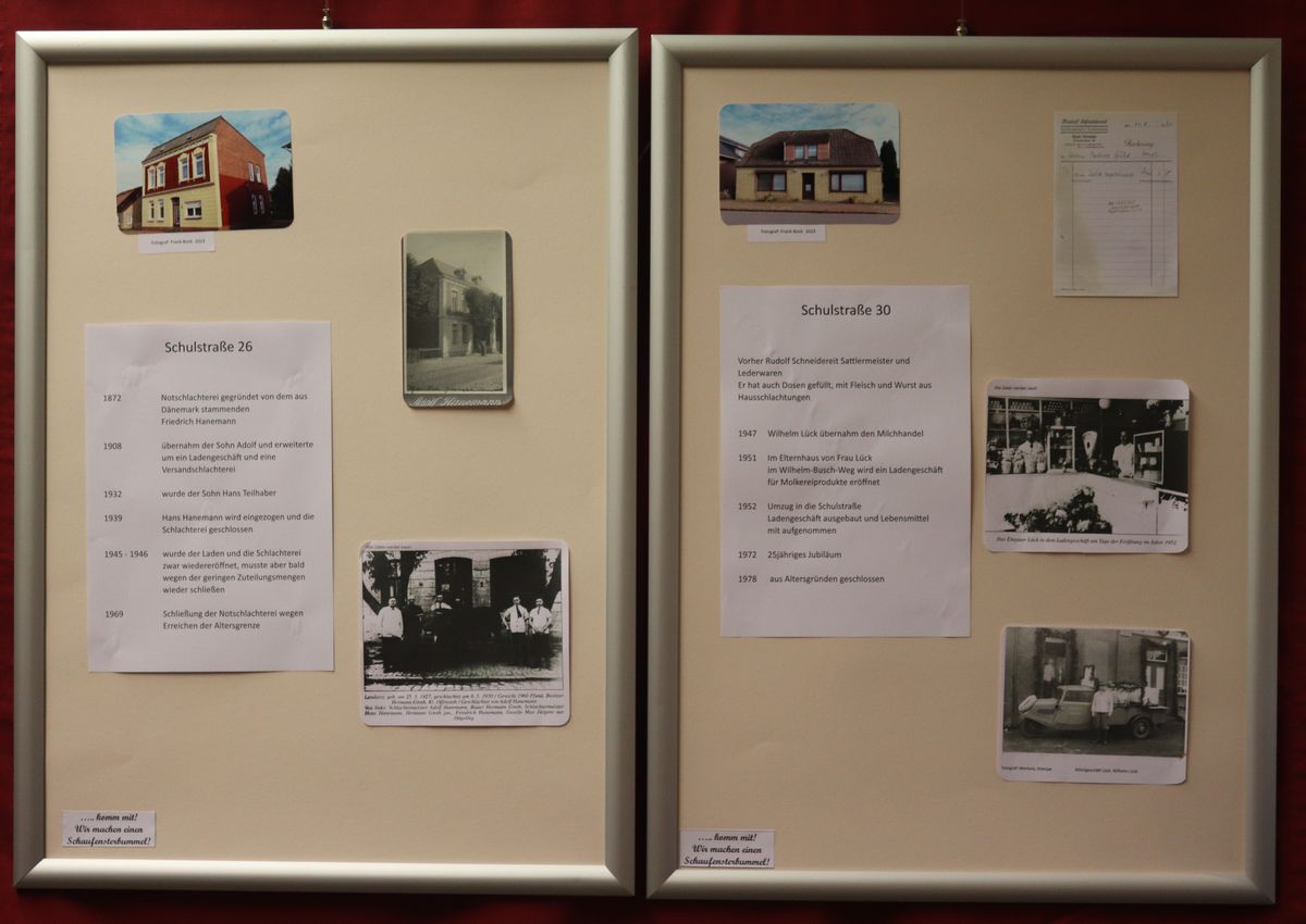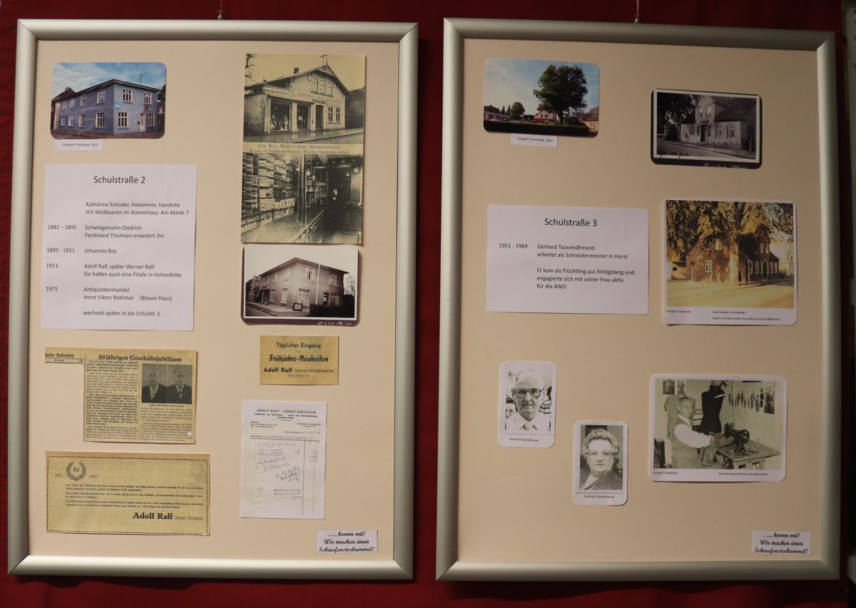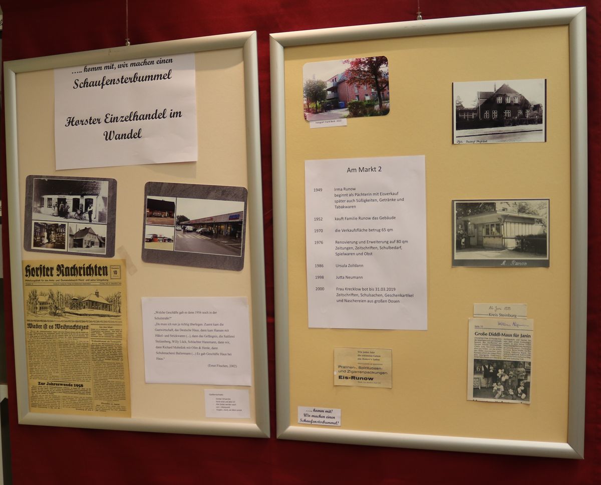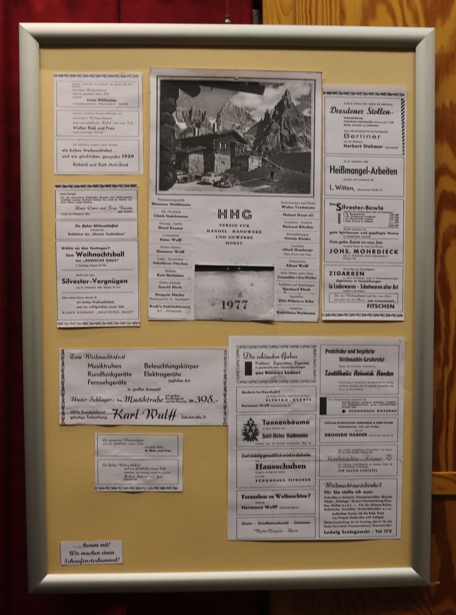Unter dem Motto „… komm mit, wir machen einen Schaufensterbummel – Horster Einzelhandel im Wandel“ stellte das Horster Ortsarchiv während des Adventsmarktes am 09. und 10.12.2023 insgesamt 23 Geschäfte vor, die früher Am Markt und in der Schulstraße existiert haben.