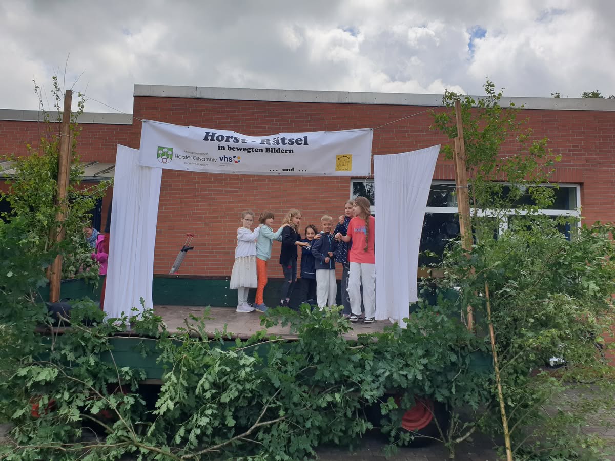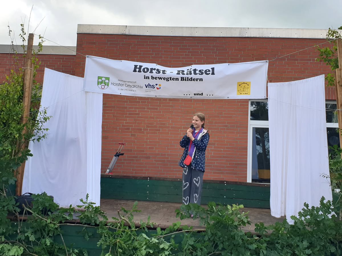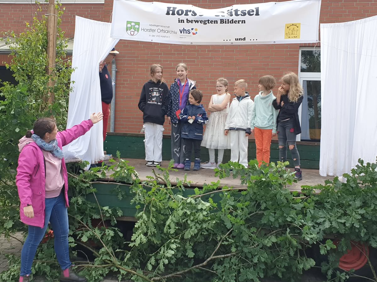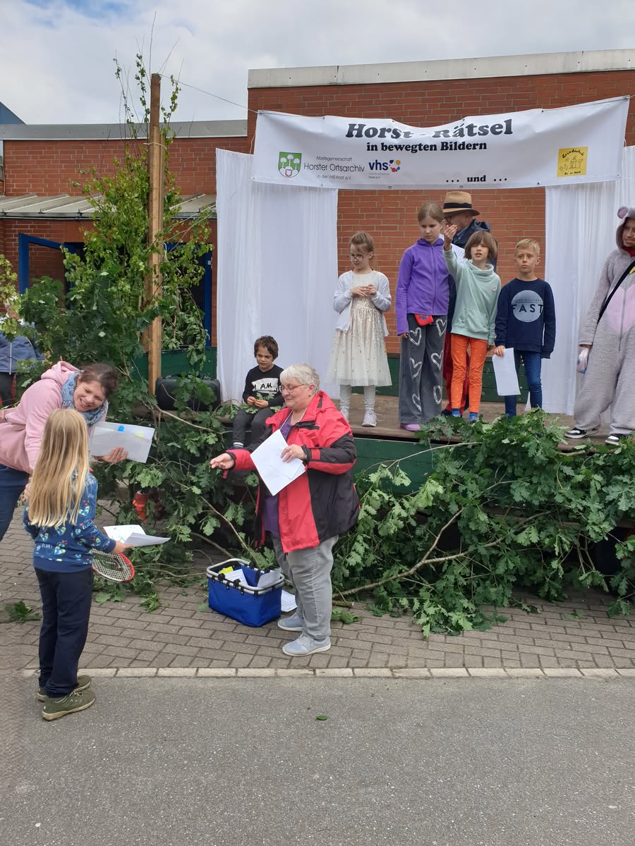 Guten Anklang fand am 15.06.2024 das vom Ortsarchiv angebotene „Horst-Rätsel in bewegten Bildern“. Dabei mussten aus 21 auf einem Zettel vorgegebenen typisch Horster Begriffen 10 erraten und angekreuzt werden. Diese Begriffe stellten sieben Schüler der Grundschule „Op de Host“ unter der Leitung von Inke Ratjen nacheinander vor.
