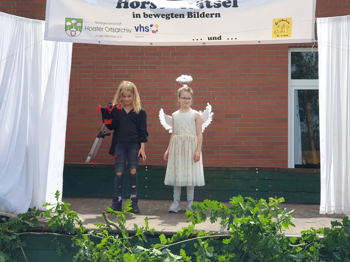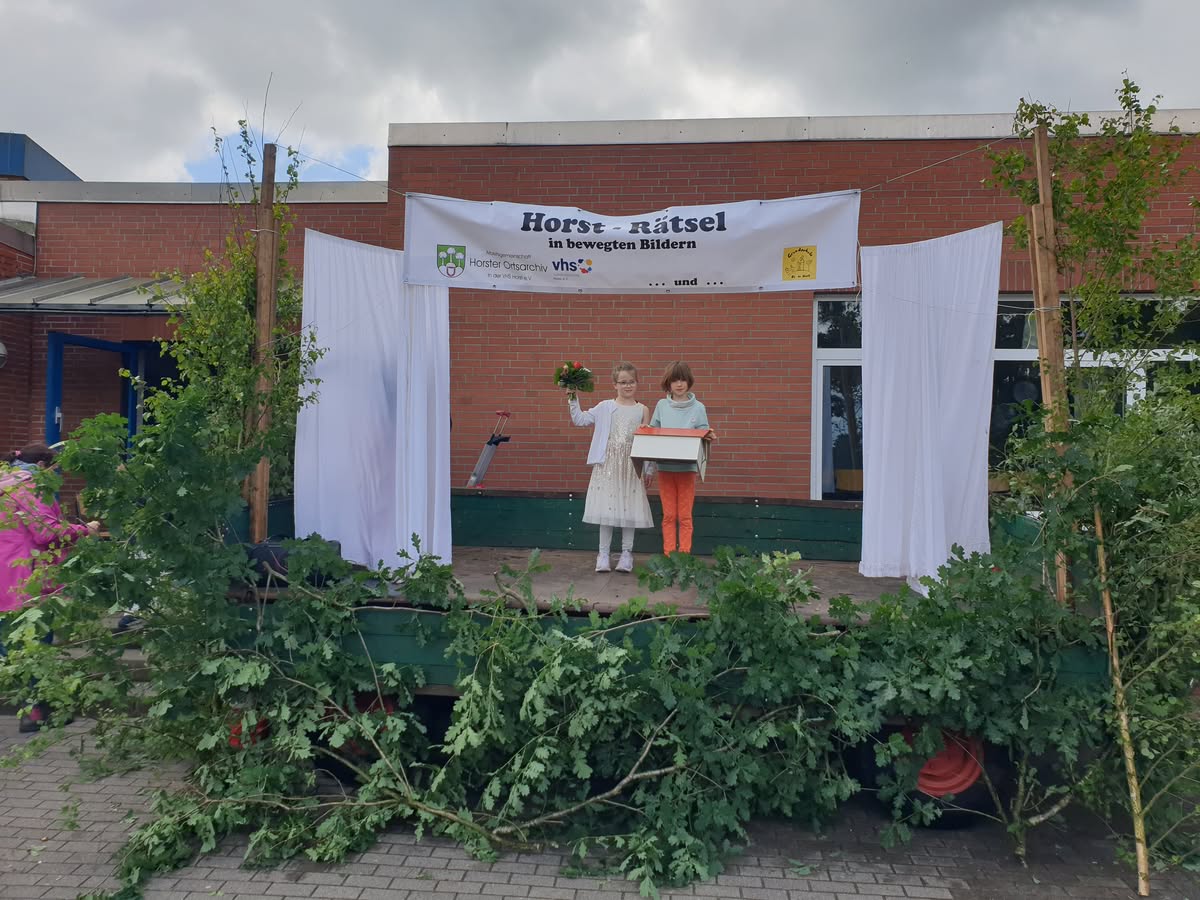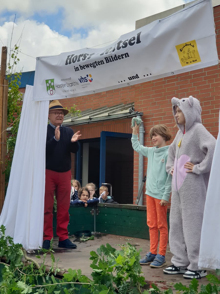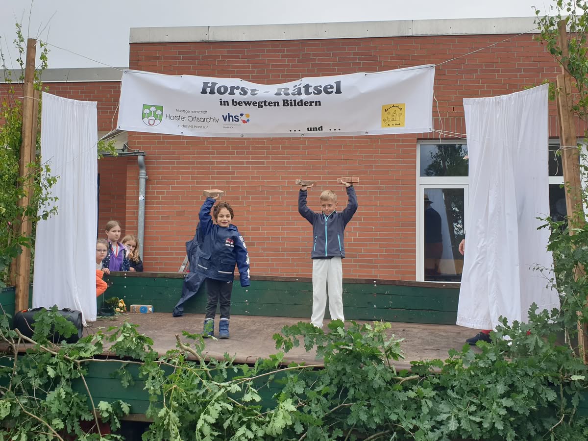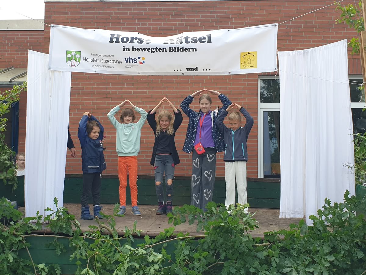 Guten Anklang fand am 15.06.2024 das vom Ortsarchiv angebotene „Horst-Rätsel in bewegten Bildern“. Dabei mussten aus 21 auf einem Zettel vorgegebenen typisch Horster Begriffen 10 erraten und angekreuzt werden. Diese Begriffe stellten sieben Schüler der Grundschule „Op de Host“ unter der Leitung von Inke Ratjen nacheinander vor.